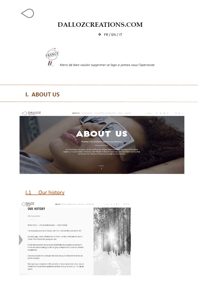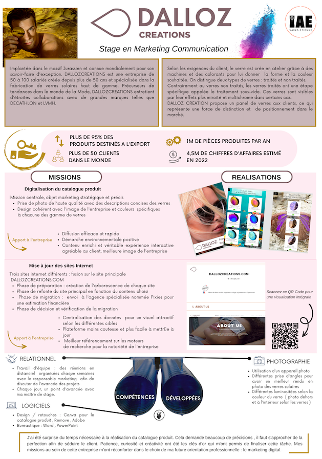 En 2ème année de licence, j’ai effectué un stage de 3 semaines chez DallozCréations. Durant ce stage j’ai été amené à digitalisé un catalogue produit et à fusionner trois Sites Internet. Vous trouverez un aperçu ci-après. Ces réalisations m’ont permis de renforcer différentes compétences illustrées ci-dessous.